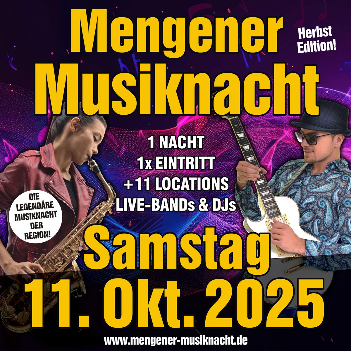 Die MENGENER MUSIKNACHT / „Herbst Edition“ findet am Sa. 11. Oktober 2025 statt! 11 Locations präsentieren nach dem Riesenerfolg des Neustarts im April’25 wirklich coole Live-Bands und DJ’s. Das Programm wird im Laufe des Septembers final veröffentlicht. Weitere Informationen zur legendären Musiknacht der Regionfindest du unter www.mengener-musiknacht.de