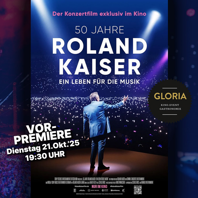 Sonder-Opening im GLORIA.KINOCENTER MENGEN: Dienstag, 21. Oktober 2025 ab 19:30 Uhr. Ein Abend voller Emotionen, Musik & Gänsehaut-Momente! Neben weiteren Highlights aus unserem aktuellen Filmprogramm feiert an diesem Abend ein ganz besonderes Musik-Event seine Premiere: ROLAND KAISER – RK50 | 50 Jahre – 50 Hits! Erlebe den Ausnahmekünstler hautnah auf der großen Leinwand – mit spektakulären Konzertmomenten, persönlichen Einblicken und exklusiven Backstage-Szenen. Ein Film, der zeigt, warum Roland Kaiser seit Jahrzehnten Millionen begeistert! Jetzt Tickets sichern und live dabei sein