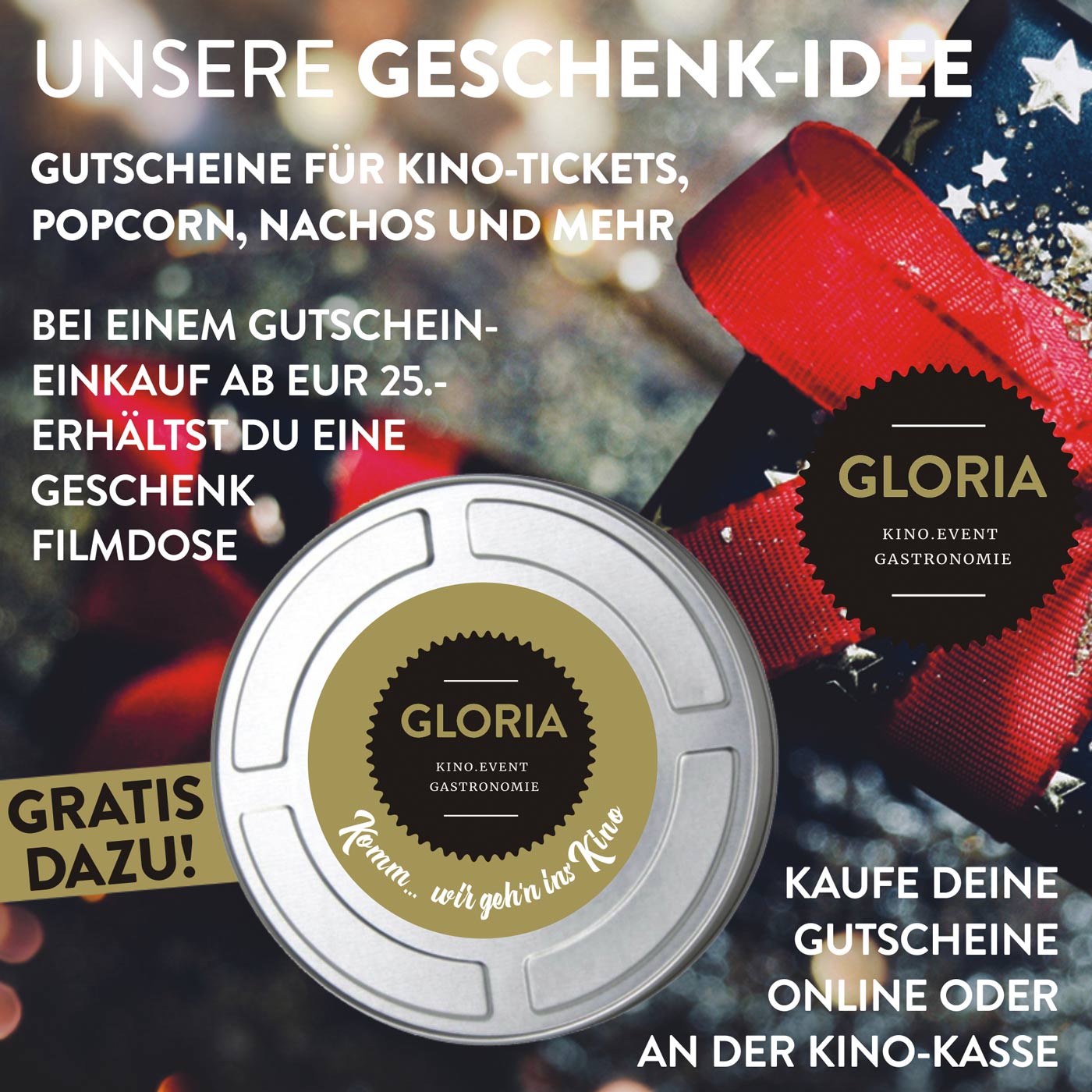 Lass dich von unserem charmanten Ambiente inspirieren und genieße Kino, wie es sein sollte – individuell und emotional . Nimm‘ dir eine Auszeit. Wir freuen uns darauf, dich bald bei uns im Gloria.Kino- und Eventcenter begrüßen zu können.